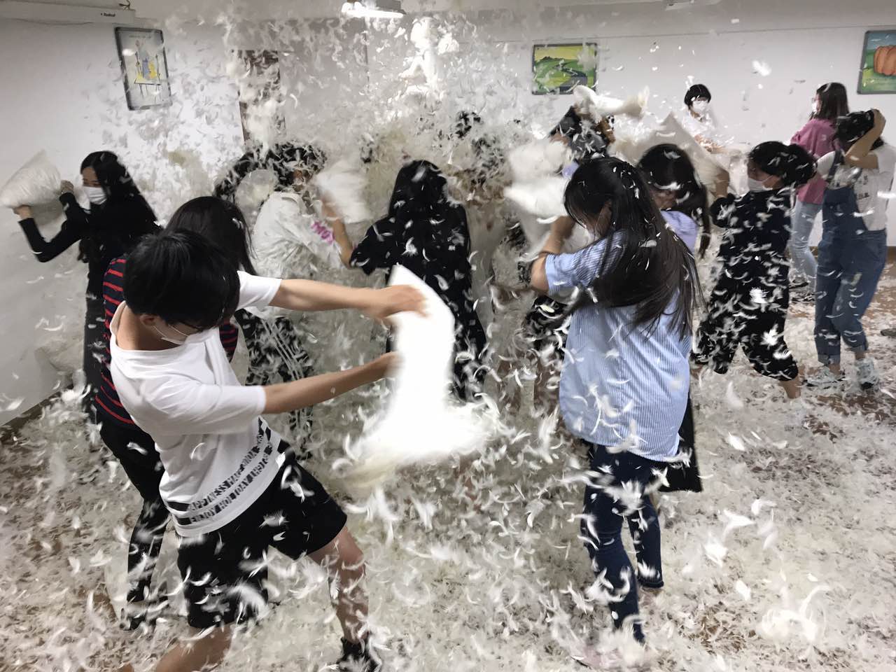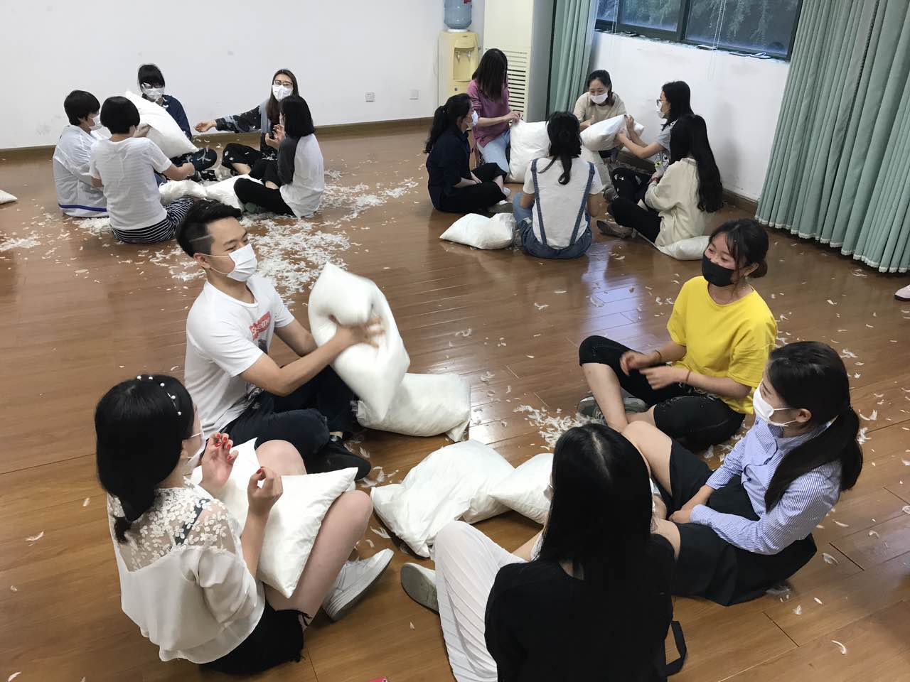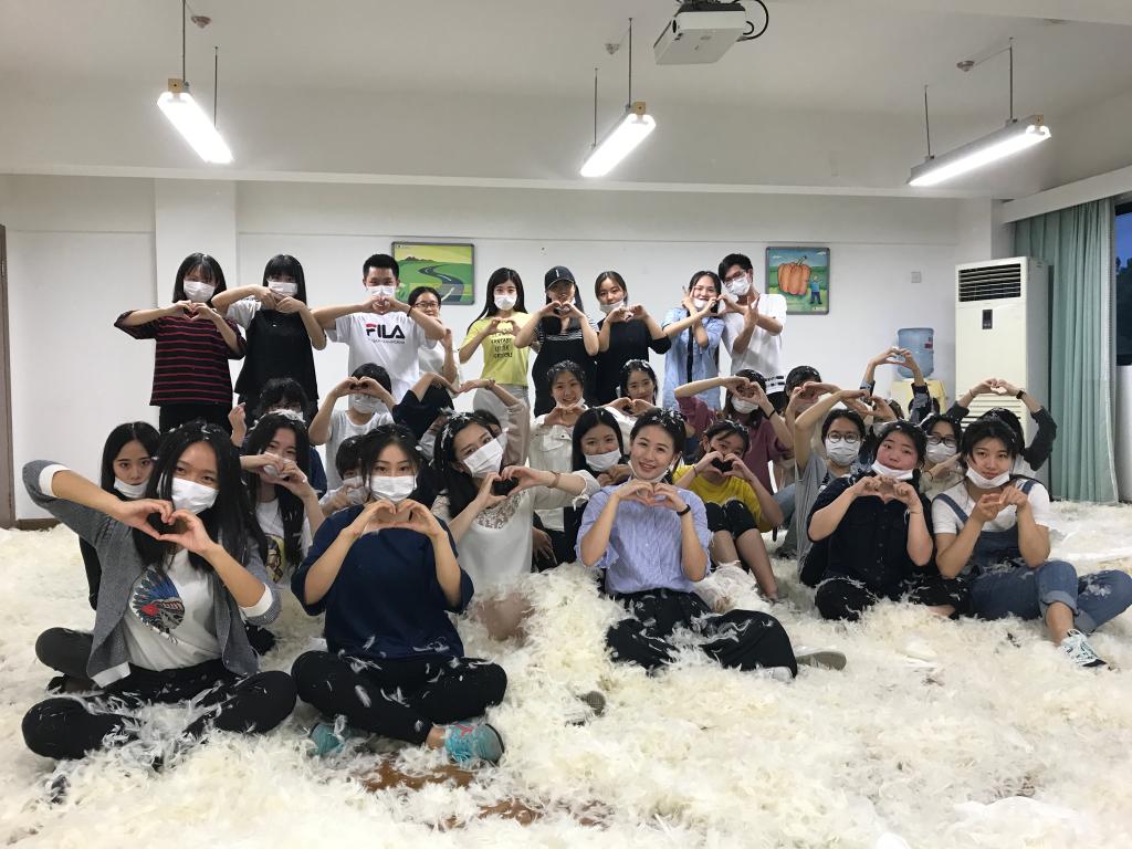 活动的第一个环节是组内热身——击鼓传花。听到音乐后同学们开始互相传递枕头,乐声停止之时手持枕头的同学遭到了其余同学的“枕头攻击”。现场高潮迭起,散落的羽毛漫天飞舞,十分壮观。在四轮热身之后,枕头大战进入到白热化阶段。工作人员将人员分成两组分别进行对战,哪一组最先将枕头里的羽毛洒完即获得胜利。两组队员你争我抢,情绪高涨,整个活动室瞬间布满了羽毛。第二轮大战结束后,参与者纷纷表示这次的活动帮他们释放了生活中的压力与烦恼,意义十分重大。