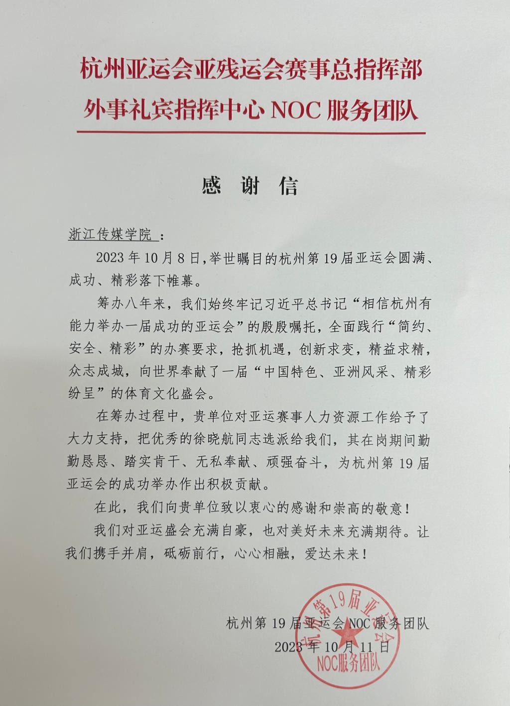 亚运会志愿者领队徐晓航老师顺利完成亚(残)运会工作。