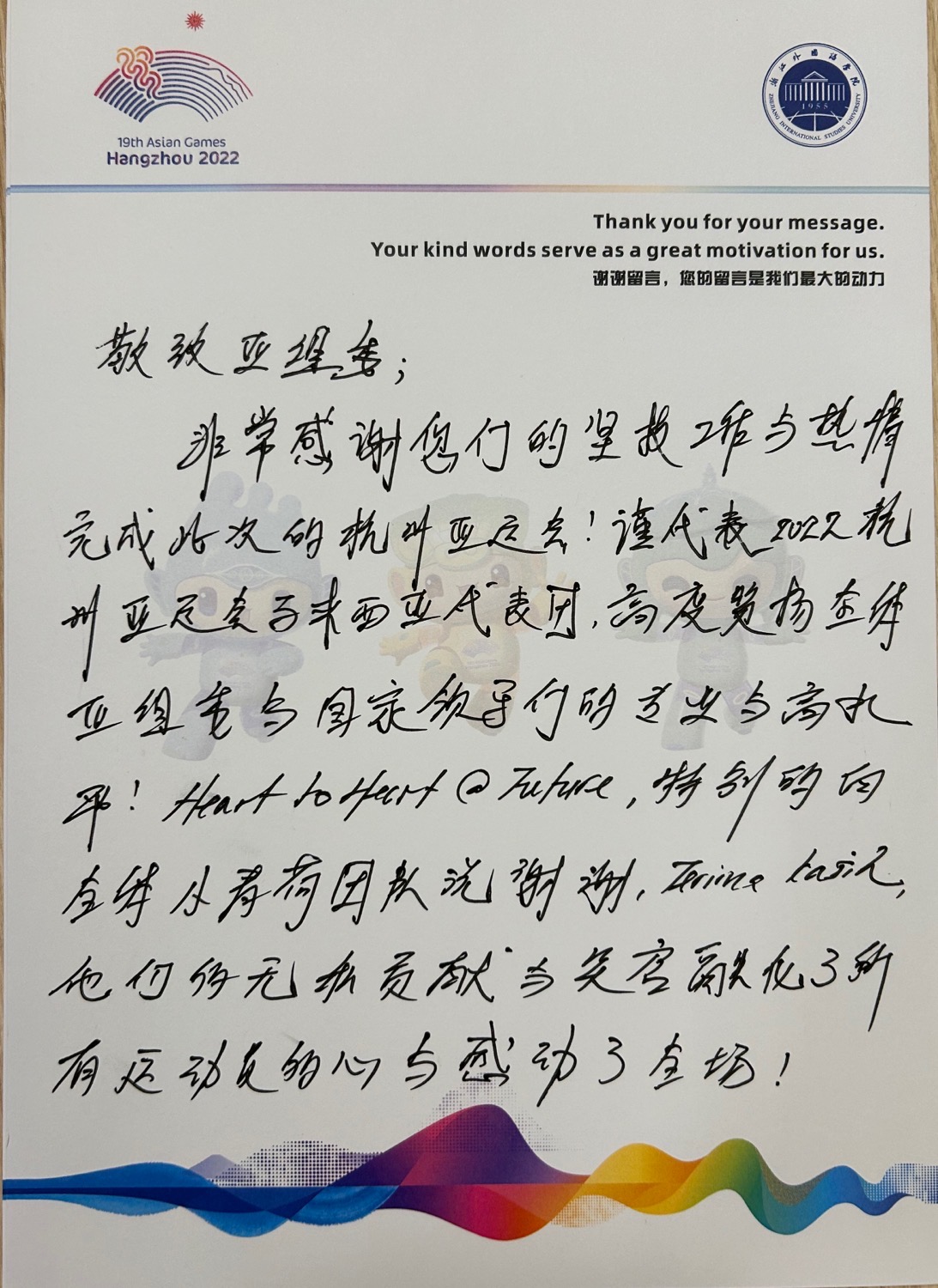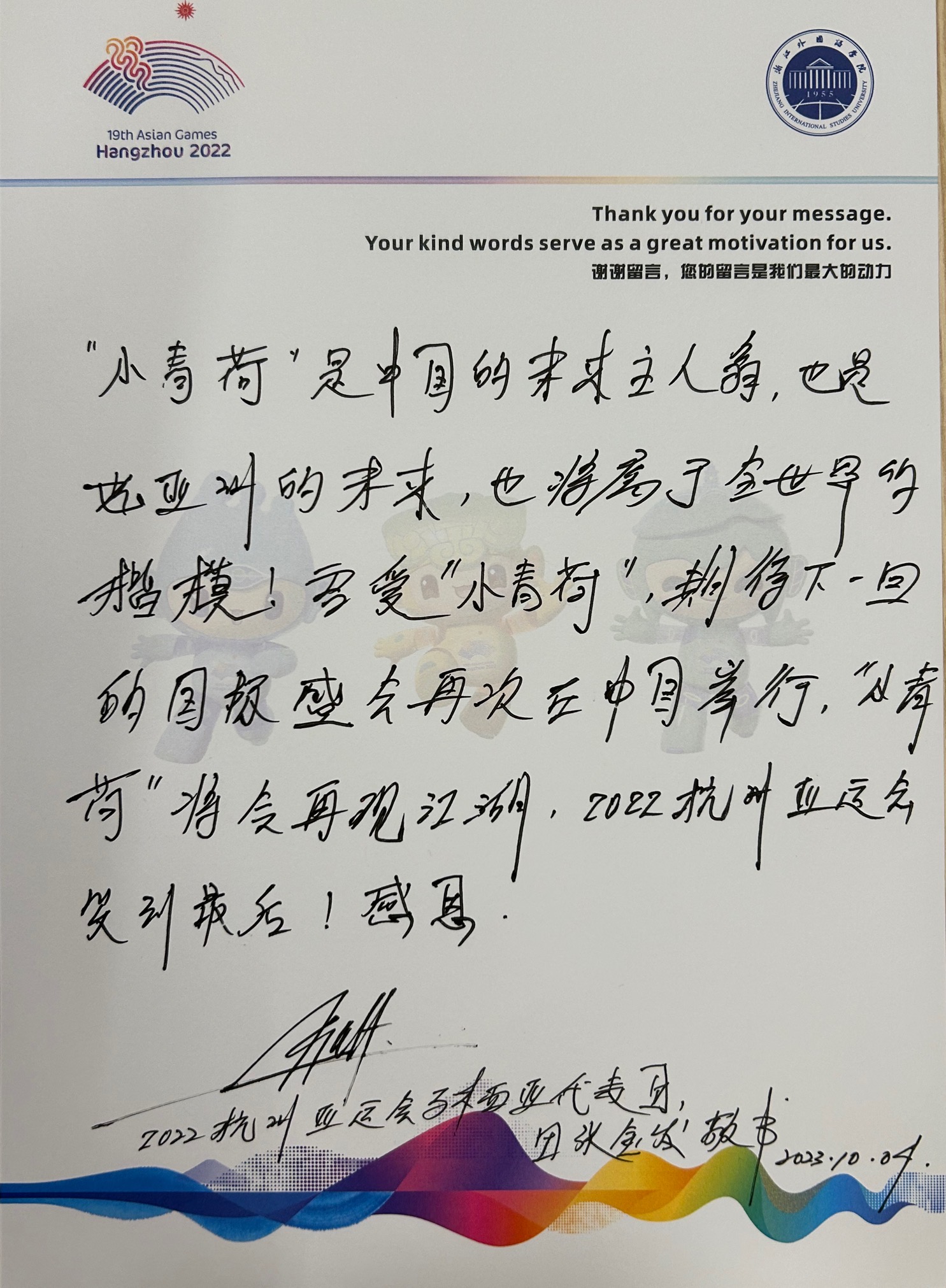 与国际友人交流期间,真挚友善,热情好客,为他国代表团的中国行增加了一抹幸福的红色,让外国友人都感受到了杭州的韵味和中国的温度。期间负责提供运动员日常训练的常温餐包以确保运动员得适当的营养和休息,以保持最佳竞技状态;每日传达村内交通时刻表信息,帮助代