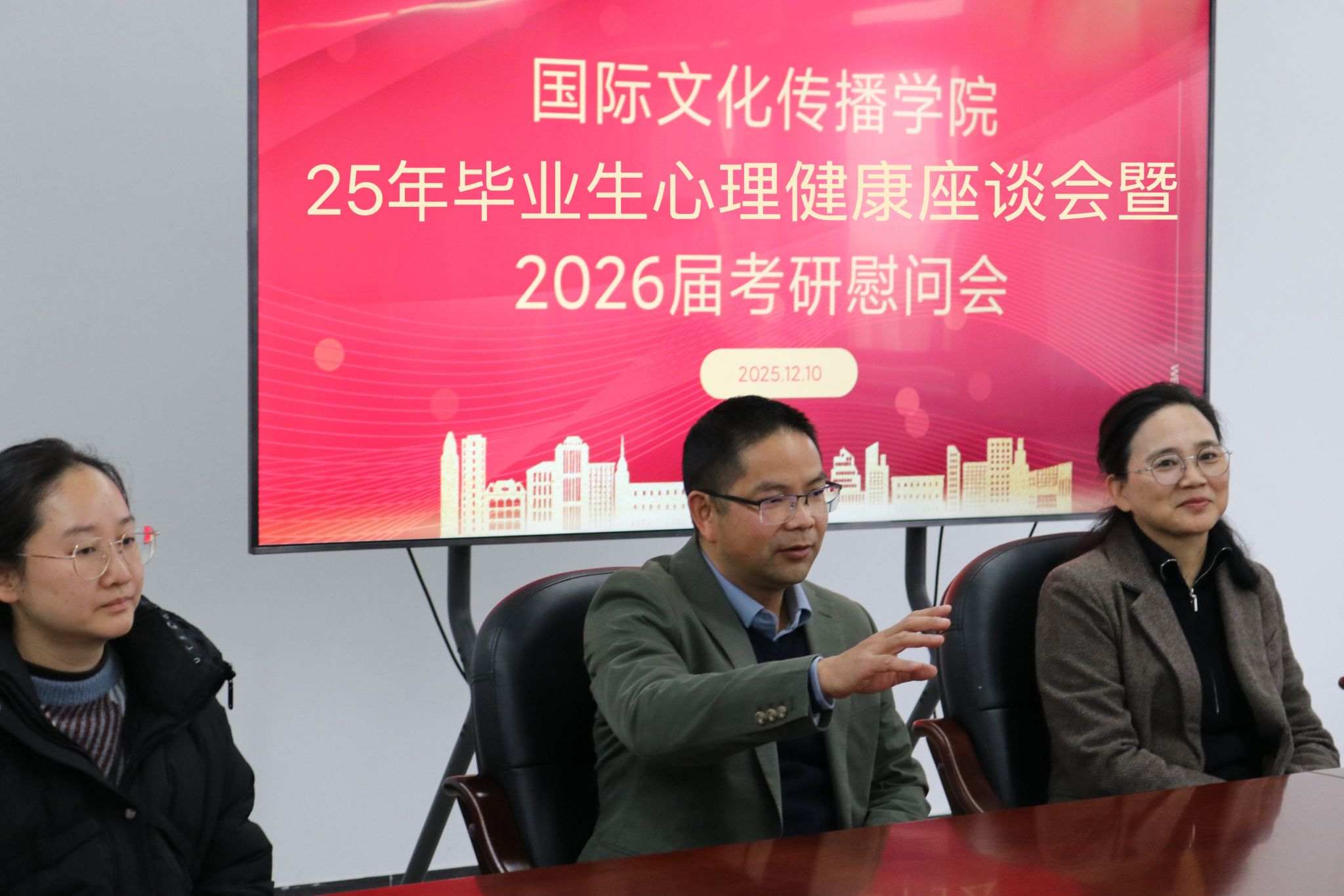 活动伊始,陈斌书记代表学院对全体毕业生表示深切关怀。他指出,毕业阶段是人生重要的转折期,无论是选择就业、升学还是其他发展路径,都伴随着期待与压力。学院始终是同学们最坚实的后盾,“国传驿家”心理辅导站将持续开放,为同学们提供倾诉、疏导与支持的空间。他鼓励同学们积极面对变化,学会调适情绪,保持积极心态,并提醒大家在寒冷季节注意身体健康,以最佳状态迎接人生新阶段。