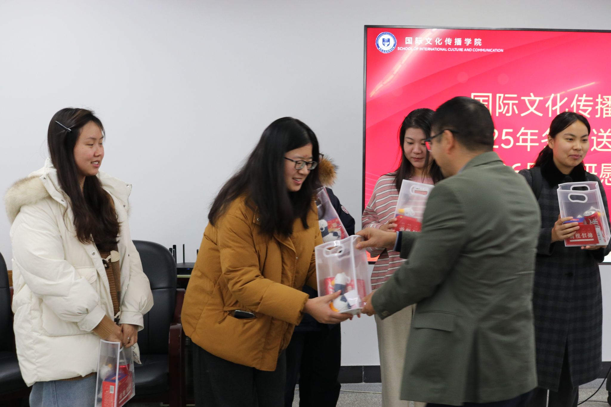 活动最后,学院领导与老师们共同为考研学子送上了象征“暖意”与“好运”的慰问礼包,内含文具、暖贴、定制鼓励卡片等。一句句叮嘱如冬日暖阳,照亮了学子们的奋斗之路。