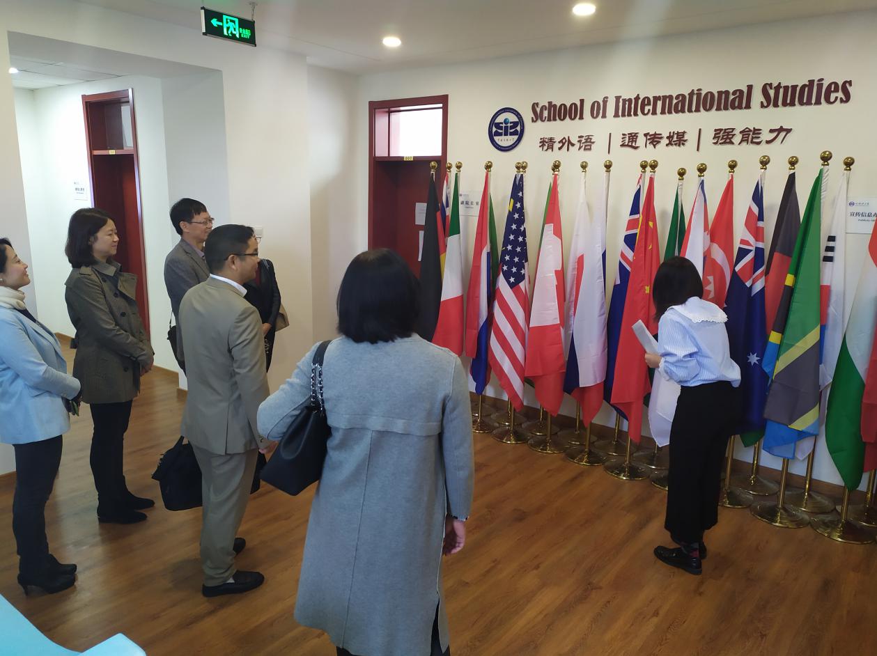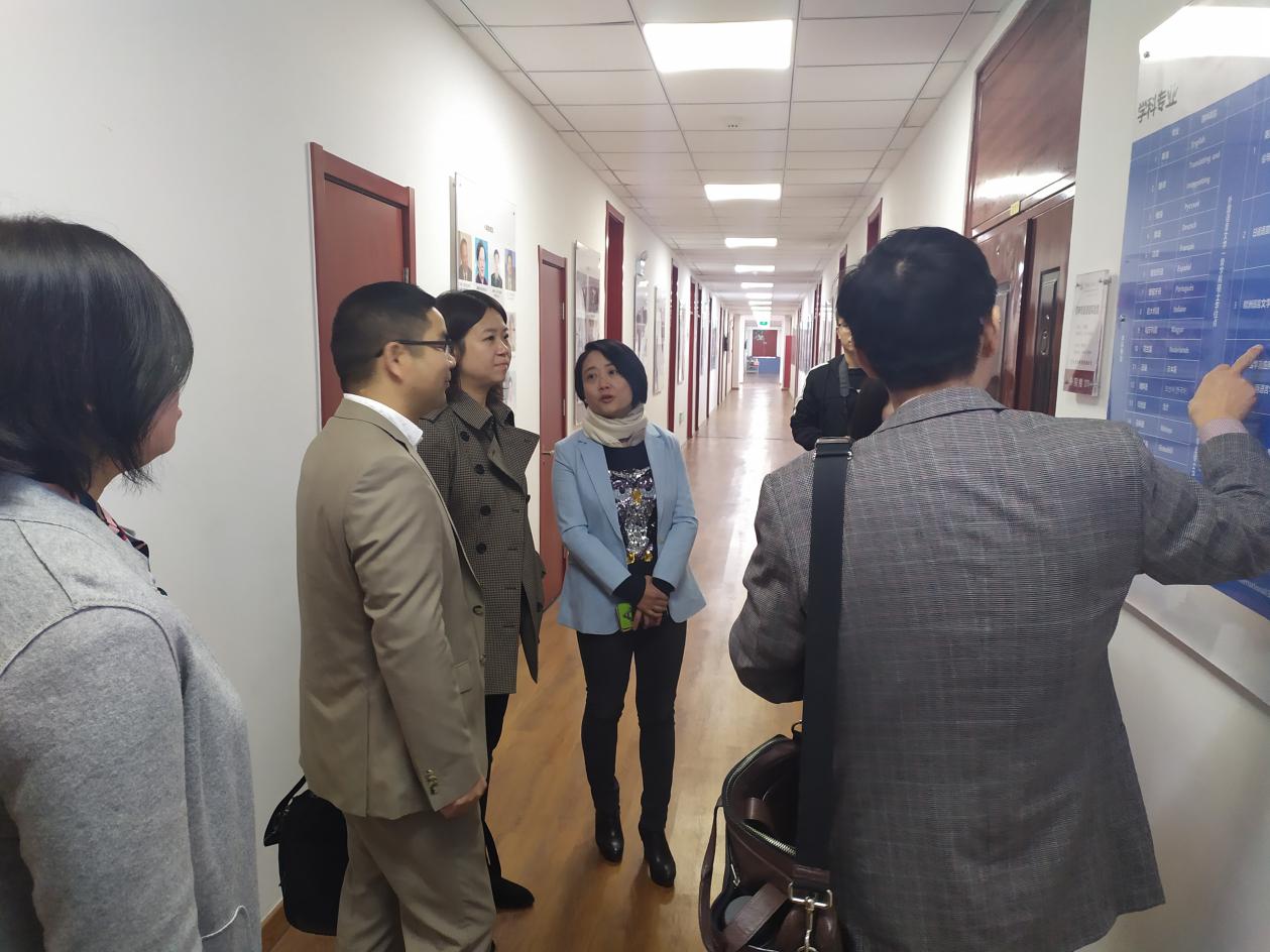 10月17日上午,考察团一行4人来到中国传媒学院外国语言文化学院进行考察交流。在中国传媒大学外国语言文化学院院长李佐文、党委书记陈江华、副院长刘颖等陪同下,考察团一行首先参观了外国语言文化学院的文化长廊,全面深入的了解学院的历史脉络和发展成就。