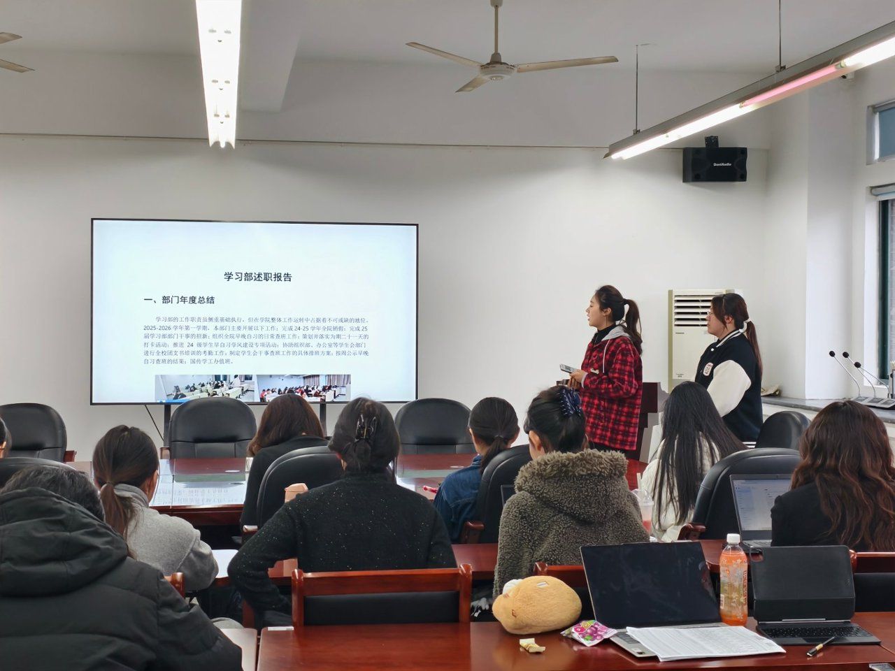 在述职评议的核心环节中,各学生社团负责人依次登台,结合社团年度运营实际,详细介绍了社团在组织建设、活动开展、成员培养等方面的发展近况,同时立足学院青年需求与社团发展定位,清晰勾勒出未来在品牌活动打造、社团影响力提升等方面的规划与展望。