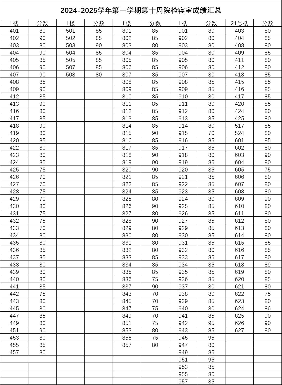 91吃瓜 2024-2025学年第一学期第十周院检寝室成绩公示