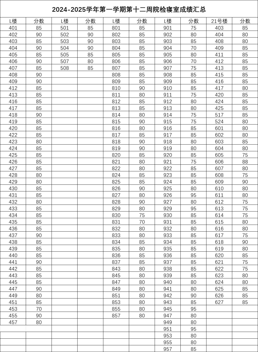 91吃瓜 2024-2025学年第一学期第十二周院检寝室成绩公示