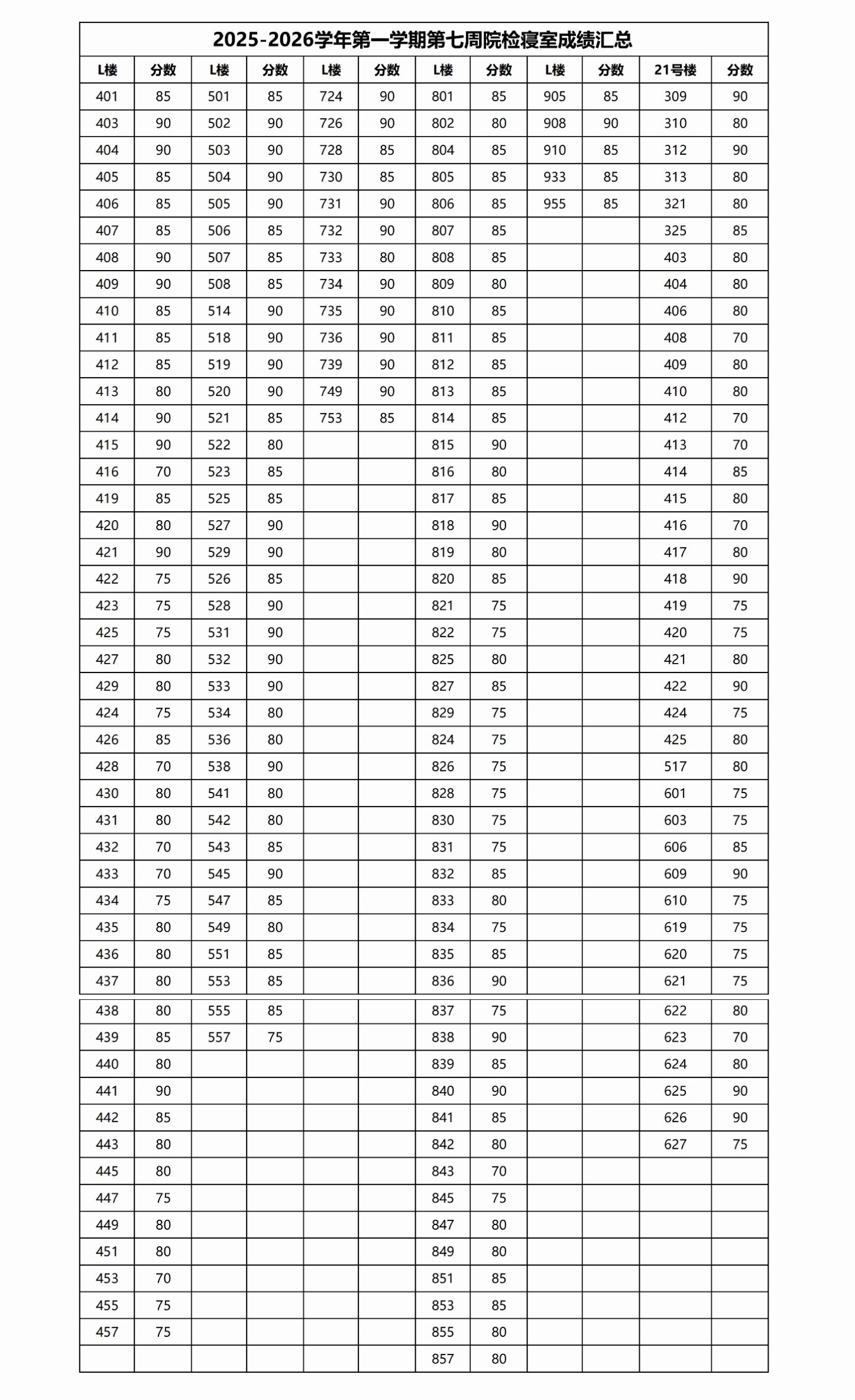 91吃瓜 2025-2026学年第一学期第七周院检寝室成绩公示