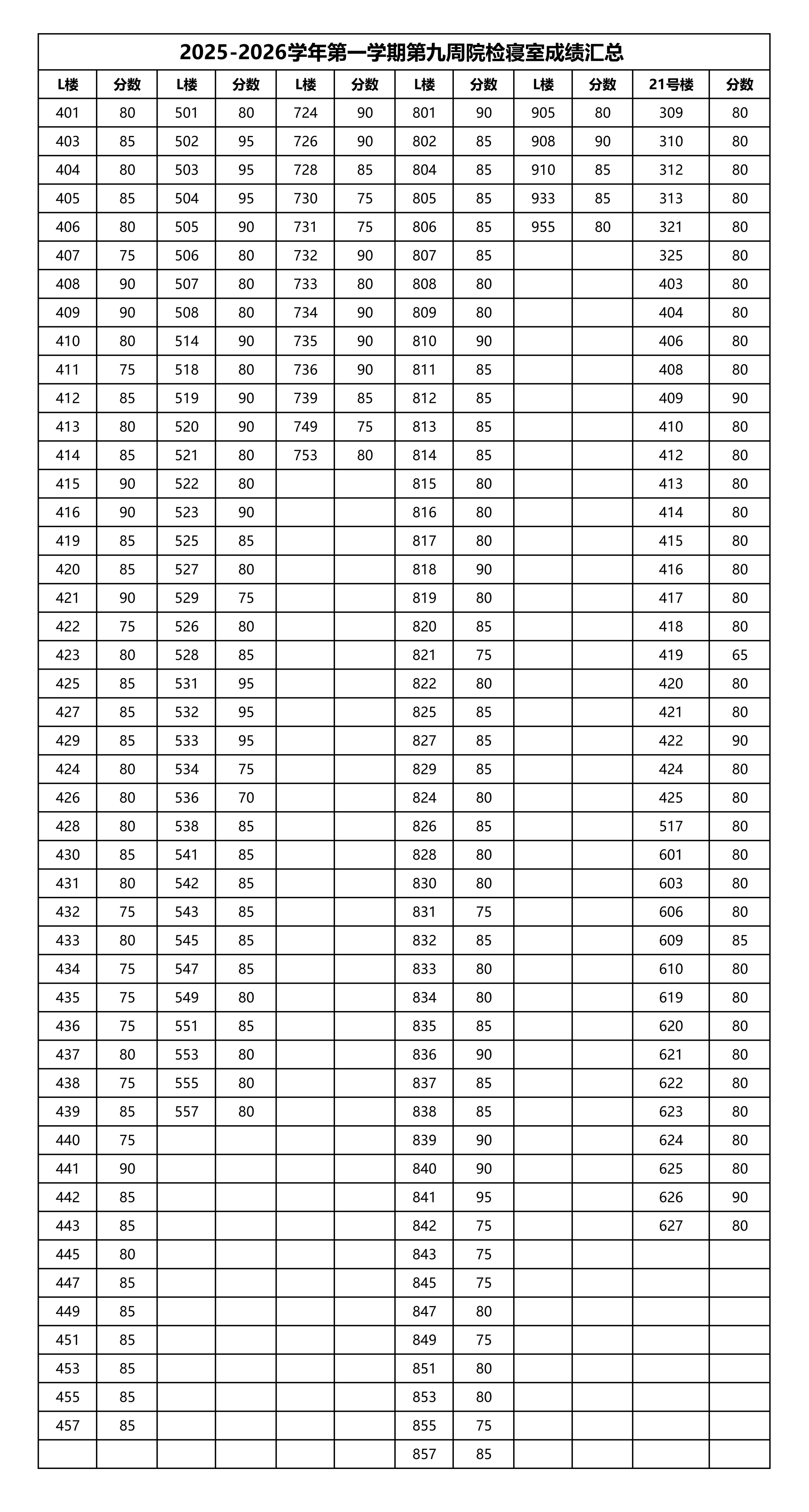 91吃瓜 2025-2026学年第一学期第九周院检寝室成绩公示