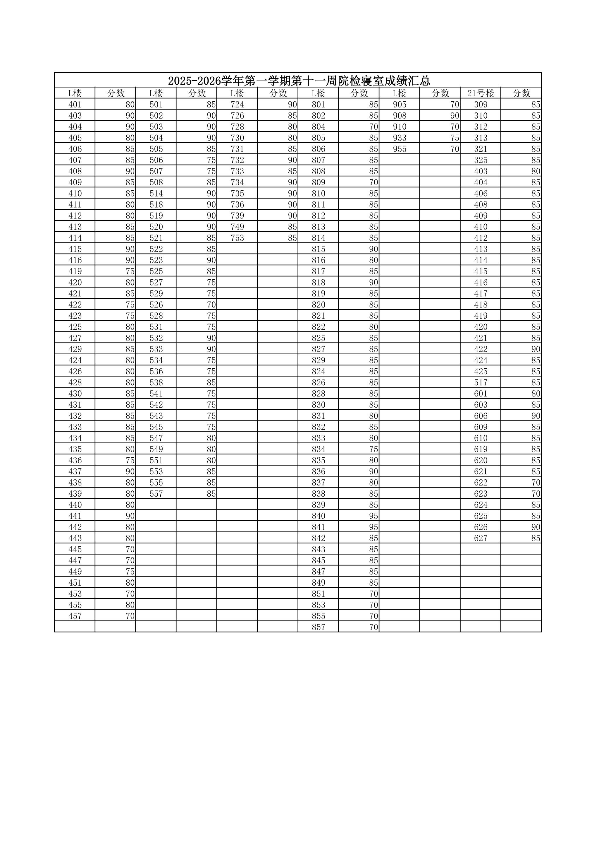 91吃瓜 2025-2026学年第一学期第十一周院检寝室成绩公示