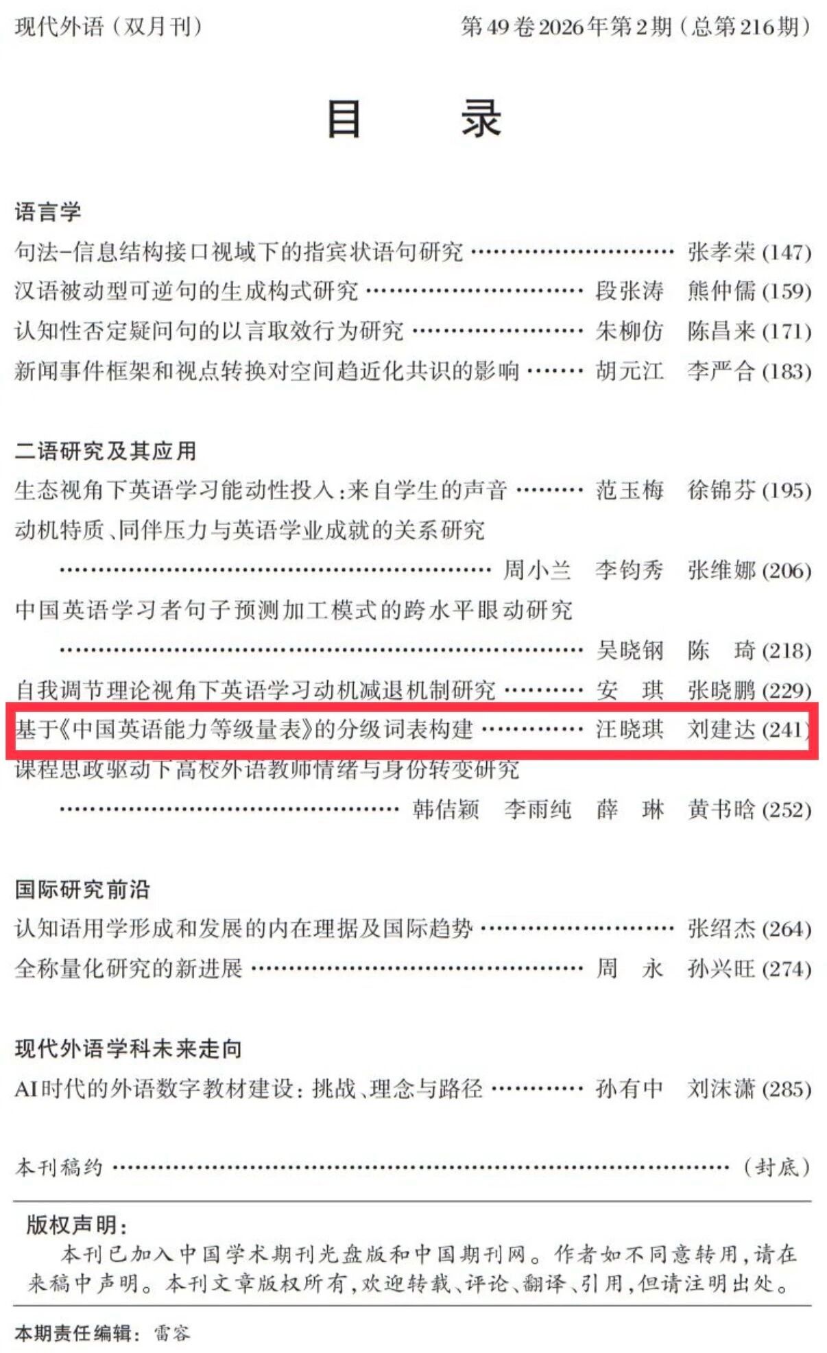 大外部教师汪晓琪的学术论文《基于〈中国英语能力等级量表〉的分级词表构建》顺利通过评审,发表在外语类一级核心期刊《现代外语》2026 年第 2 期,这是91吃瓜