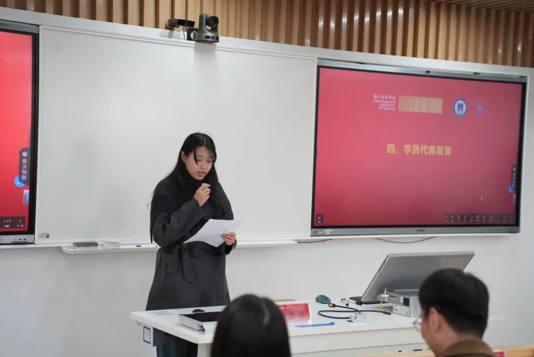 23级播音与主持艺术(双语播音)1班姚馨晨同学作为学员代表发言。她结合个人学习与实践活动进行了分享,并表明了积极向党组织靠拢的坚定决心。