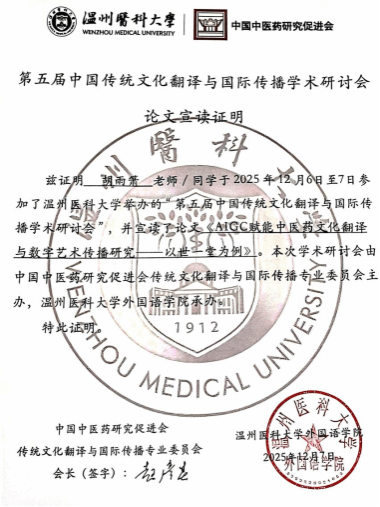 研究生胡雨箫在12月6日下午 “人工智能与中医药翻译”平行分论坛做了题为“AIGC 赋能中医药文化翻译与数字艺术传播研究——以世一堂为例”的交流报告。