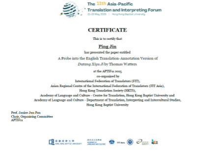 金萍赴港参加第11届亚太翻译论坛颁发证书